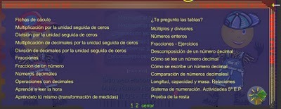 El resto de las categorías de juegos se encuentraen la barra amarilla superior de esta página; pinchando en cada botón puedes practicar con juegos todas las operaciones básicas, los enteros, decimales, fracciones, juegos de tiempo y dinero, geografía y vocabulario en inglés. Muy entretenido.